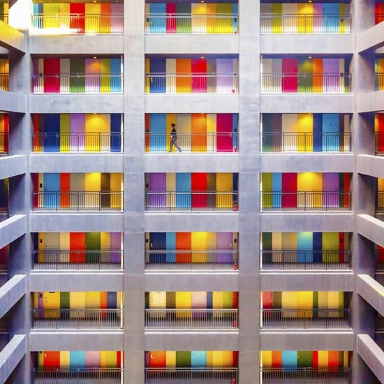 Kleurrijke gangen in appartementencomplex in Tokyo. Deze foto is ook verkrijgbaar in een staande variant. Bekijk deze foto hier in een staande versie.