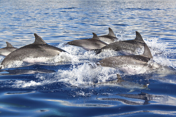 Een groep springende dolfijnen in het blauwe water bij de Azoren.